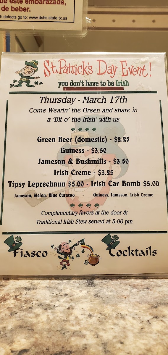 Fiasco Cocktails & Sports Bar is the ultimate destination for locals seeking a vibrant atmosphere filled with delicious drinks and engaging activities. Located in San Antonio, this bar offers a diverse menu featuring tantalizing cocktails alongside a selection of refreshing beers, including Shiner Bock and Guinness, at unbeatable prices. Customers rave about the attentive, friendly staff who create a welcoming environment that feels like home.